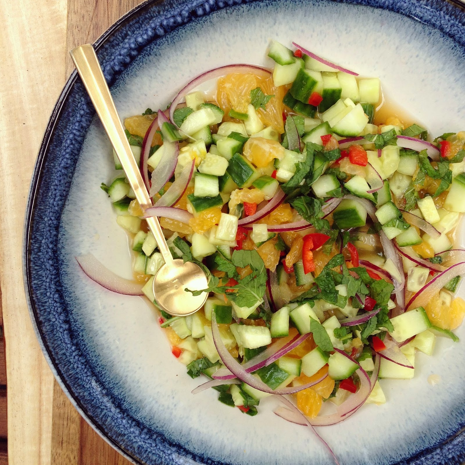 I realized it has been awhile since I last posted a fish recipe. Matt has been burned out on meatless Monday meals so he suggested we start doing fresh fish on Mondays which I am all for. If you have a local fish market I highly suggest buying the fish there, it just tastes so much better and is fresh not frozen. I buy ours at Huffs Seafood on Folly Road and I know in Charlotte at the Kings Street Farmers Market they have great fish too. I usually just ask the people what the freshest fish is and go with that. This recipe is adapted from a recipe in Gwyneth’s Cookbook Its All Good- I still love my girl and her cookbook, it never disappoints. The original recipe calls for clementines which I could not find so I subbed tangelos. I think this relish would also be great with peaches or pineapple instead. The cucumber, mint, hot pepper, and fresh citrus fruit are so such a vibrant flavorful combo. I also think you could use other fish for this recipe like Mahi or Salmon- whatever you can find. This is the perfect Summer meal.