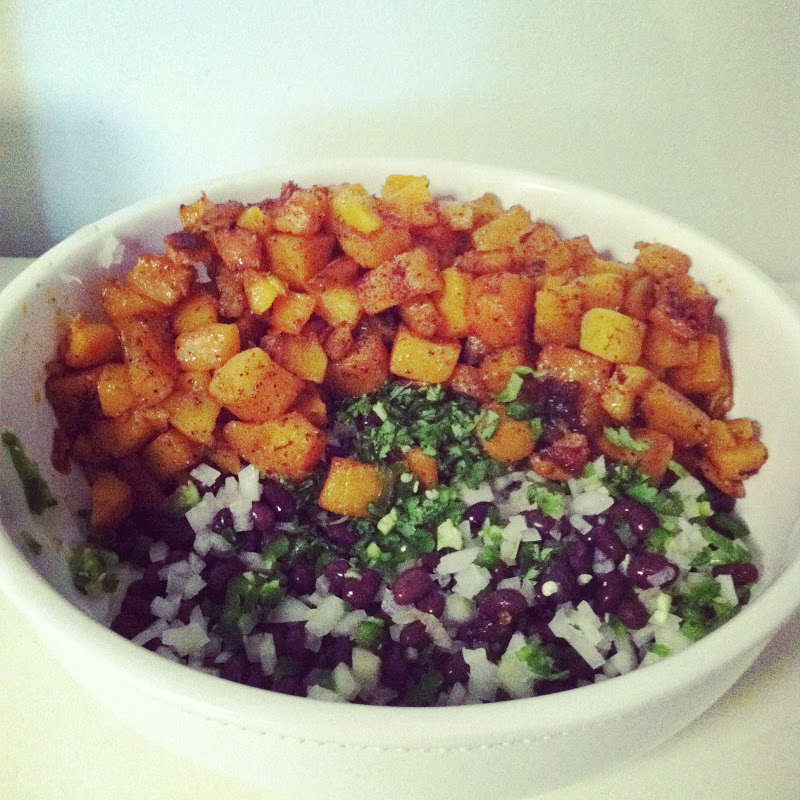 In a medium bowl, stir together roasted butternut squash, beans, chopped onion, jalapeno, and cilantro. In another medium bowl, stir together salsa and yogurt and several dashes Tabasco green sauce.