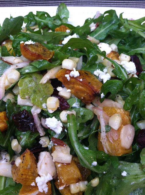 This is a great fall salad. The colors are just gorgeous. You could easily roast the beets + corn and make the dressing ahead of time and then just toss everything together when ready. I used golden beets because they were on special and looked so fresh at Earhfare but you could def substitute red beets if that is all you can find. Goat cheese and beets always pair together so well. This salad is a great combo of salty, creamy, crunchy, and slightly sweet. Get ready for new your favorite salad!