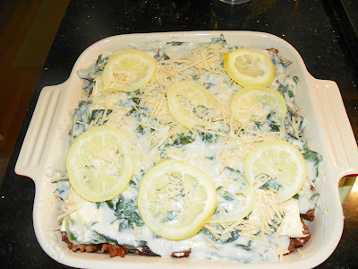 4.Spread 1/4 cup sauce in an 8-inch square nonreactive baking dish. Top with 2 noodles, half the sausage, and 1 cup sauce. Repeat. Top with a layer of lemons, 2 noodles, then remaining sauce and lemons. Bake, covered with parchment-lined foil, for 27 minutes.