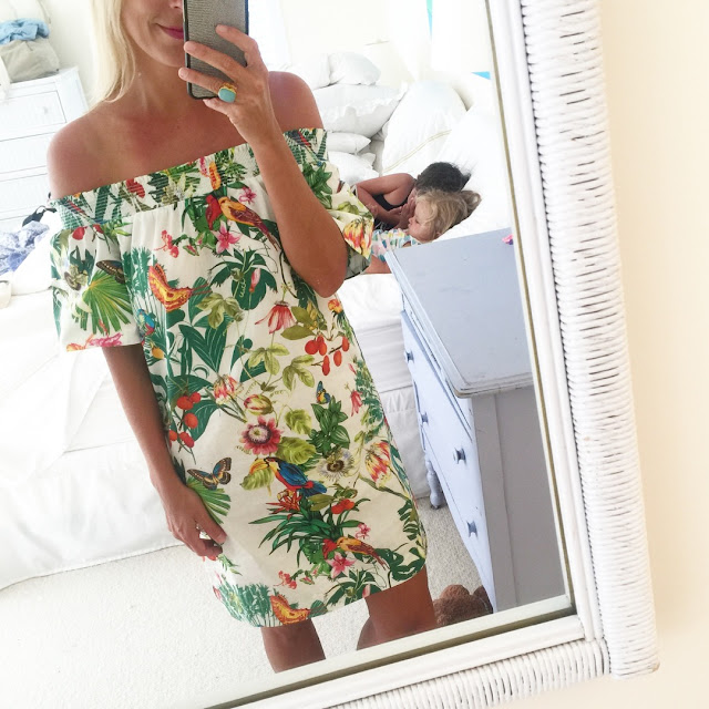 This off shoulder dress was perfect for our last night. I love the fun floral print. I had a few questions about fit and I found it ran tts. I am wearing a size 4.