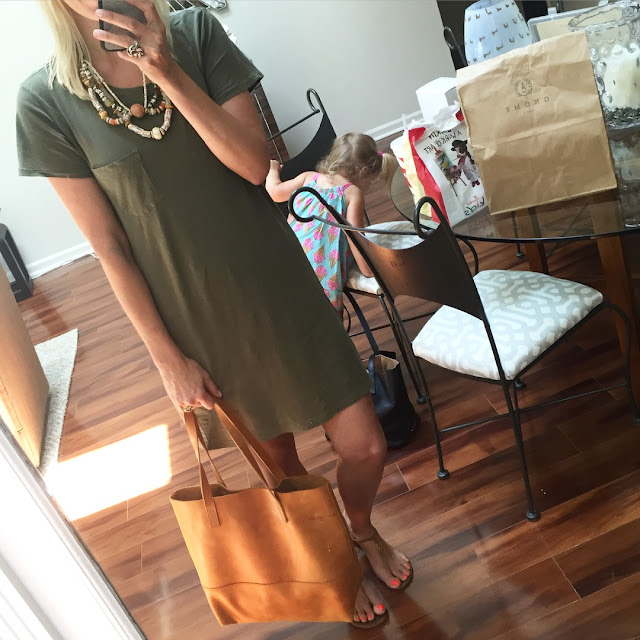 Tee Shirt Dress (use code WEEKEND to save 30%) | Necklace | Sandals | Tote