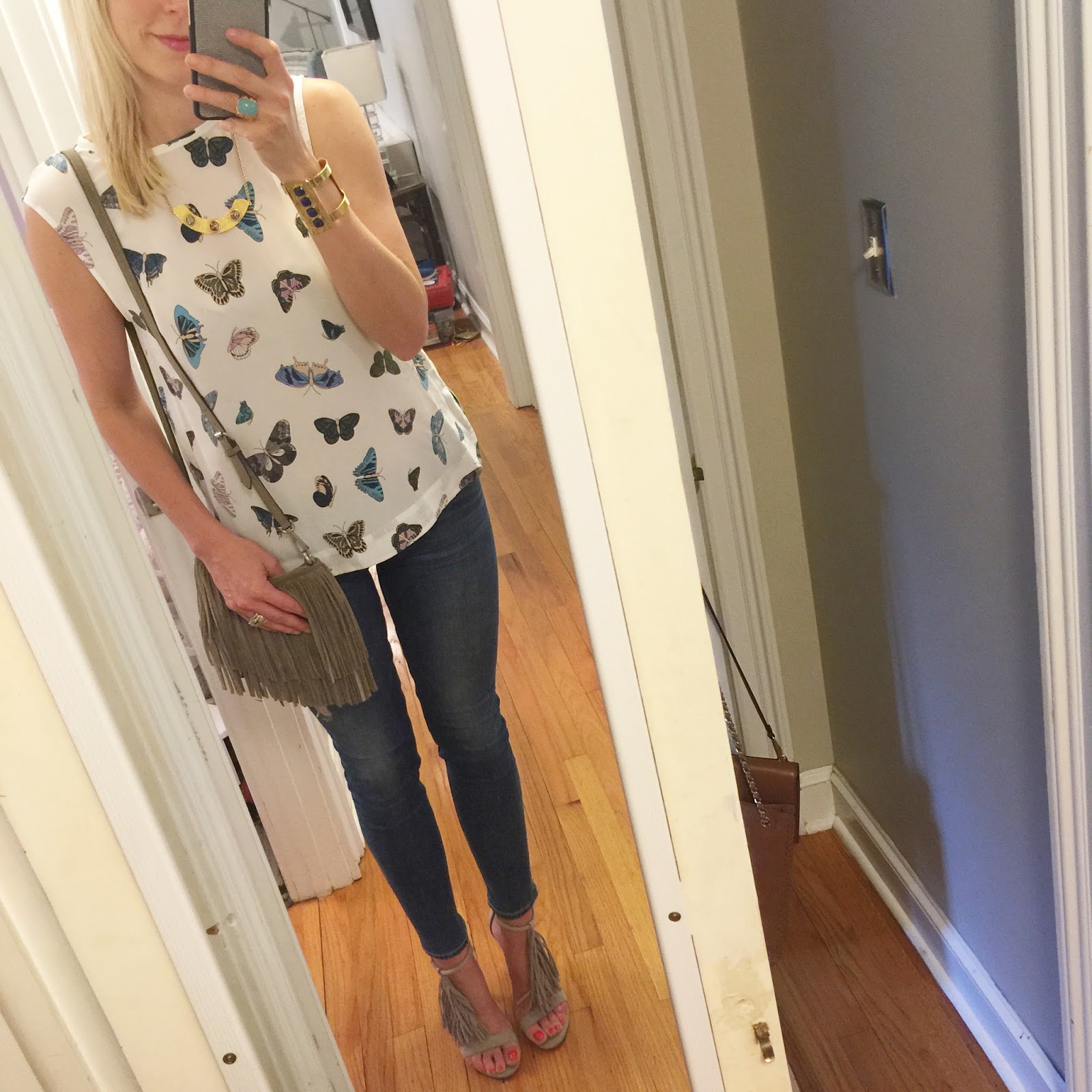 Butterfly Blouse (on sale ) | Candyshop Vintage Necklace | Jeans | Fringe Heels | HD bracelet | RM Fringe Purse