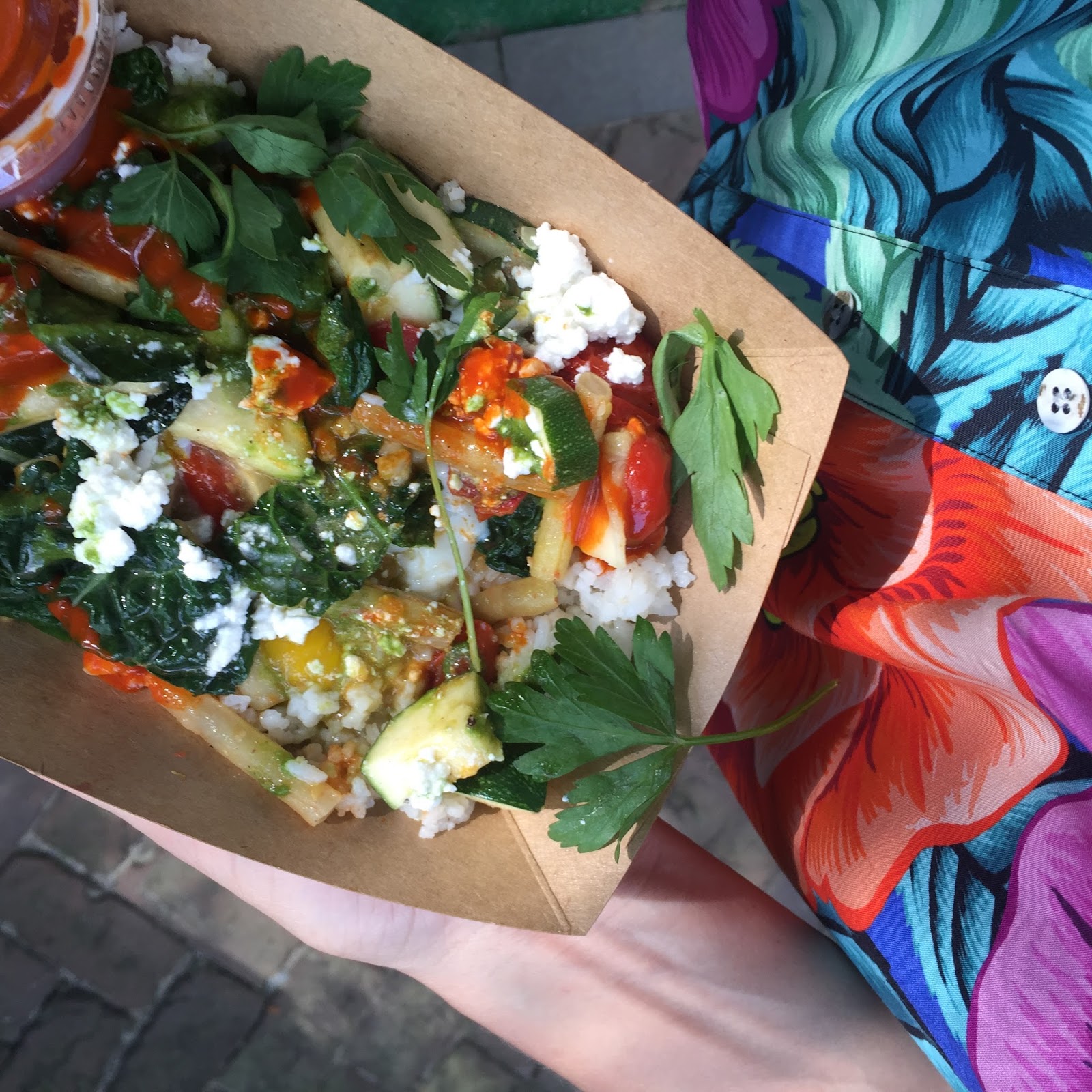 Saturday was the Farmer’s Market. I have a new breakfast obsession from The Outta My Huevos food booth. It is Carolina gold rice with local veggies, feta, chimichurri sauce and 2 eggs over easy. It is so good.