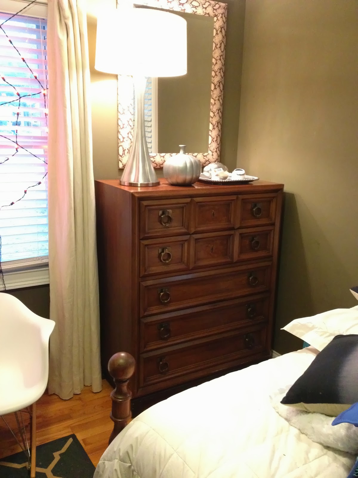 Sterling also got a new chest from my grandfathers house. I love the vintage look and feel of it and how special it was his great grandfathers. And yep that is a light up spider-web you see in his window and pumpkin on his chest. Sterling is obsessed with Halloween so we let him put some decorations in his room:) The clutter drives me crazy but it makes him happy!