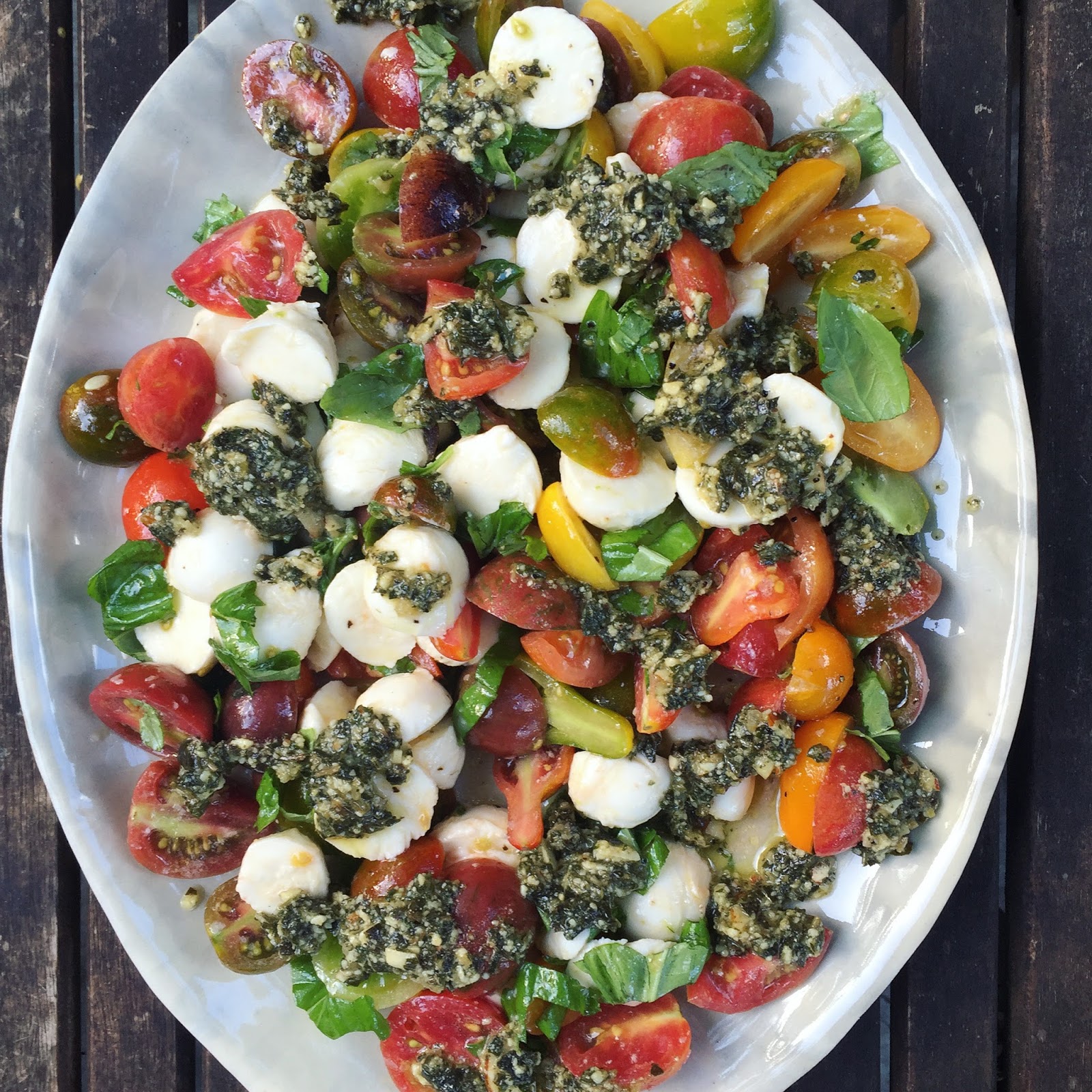 Cherry Tomatoes + Fresh mozzarella balls + basil + pesto. Also add a little salt and pepper:)