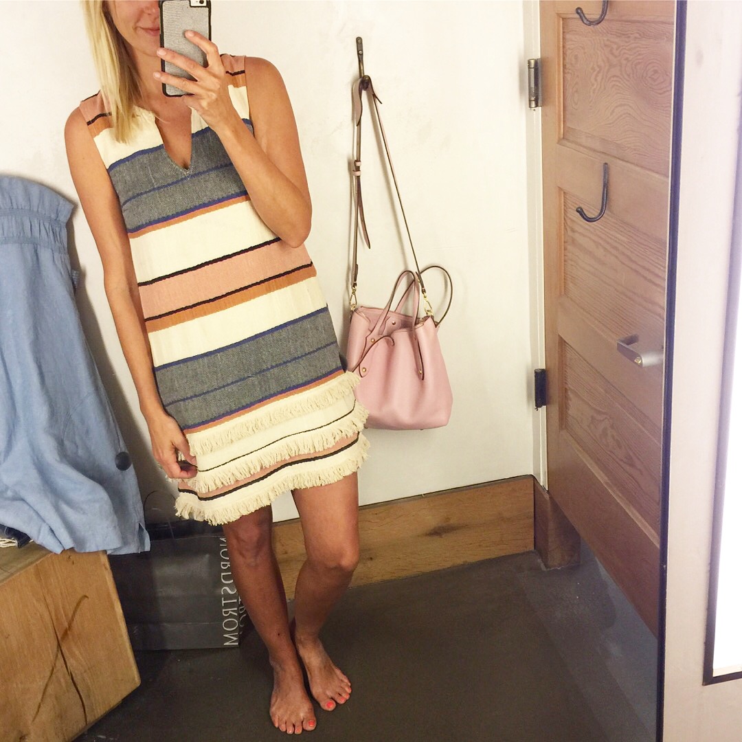 One of my favorite dresses from this Summer is back out in a new stripe color for Fall. I found it when I bought my chambray dress in Charlotte. Sizes sold out pretty quickly last time and a few are already sold out. I am wearing a size 6 for reference. I am usually a 4 in dresses but the 4 was a little snug at my hips.