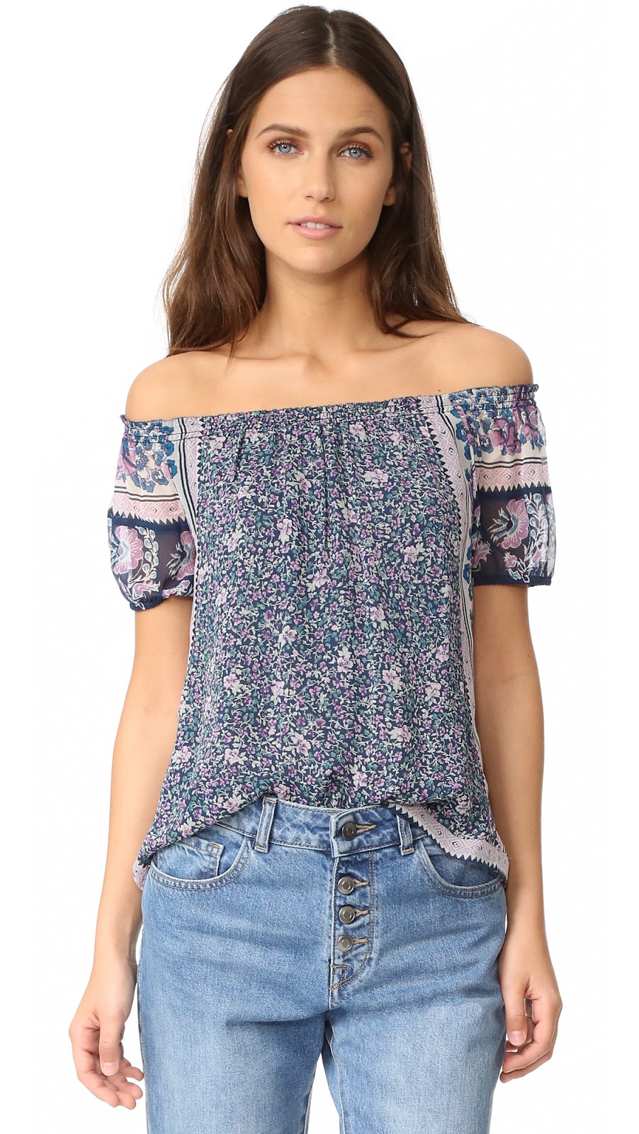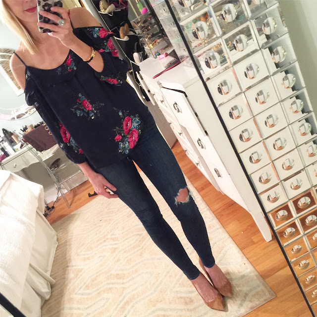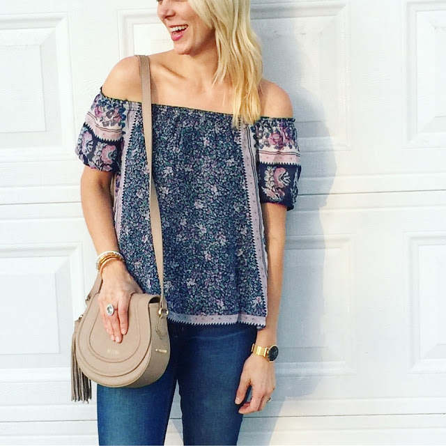 I shared this blouse last week. It is a fun spin on an off shoulder blouse.