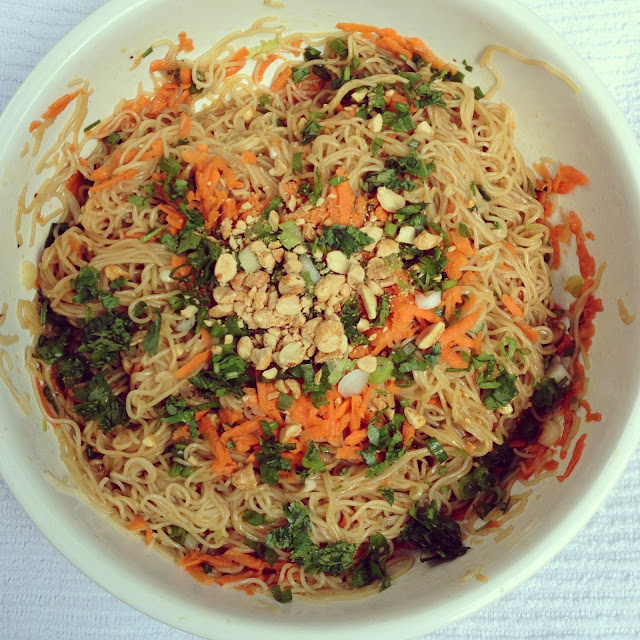 I have become obsessed with Thai food this year. I thought it was pregnancy cravings but nope I am still craving it. These Thai Noodles are off the hook good. So easy to make and they save well in the fridge for days! I found this recipe on Pinterest, there are about a million Thai noodle recipes on there! I really liked the ingredients in this one because I basically had everything on hand to make it. I recommend using angel hair pasta or even better the the thin Asian Noodles in the international aisle at the grocery. You can save prep time by pre-chopping the veggies and nuts and then just toss everything together for a quick meal! I think this would be great served with chicken and/or shrimp for a heartier meal. I made a big batch and ate it as lunch one week.