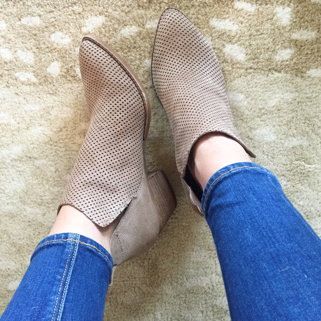 I have been on the hunt for some comfortable ankle booties for everyday wear with a lower heel. I recently found these booties and love them. They also come in sand and black. They run TTS but slightly on the large side. I did my normal size 9 and they are a touch loose but I was afraid the smaller size would be too small. With ankle socks they are perfect.
