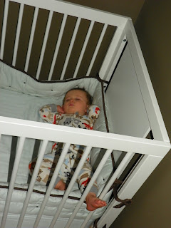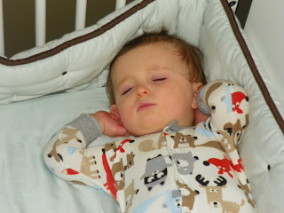 My heart is melting. I love that his foot is poking out through the crib. I love that he always sleeps with his arms behind his head like this. I also love how pensive he is when he sleeps. I want to crawl in his crib and cuddle with him. Considering the amount of wine I have had and my weight, probably not a good idea. Sweet Dreams to you all!