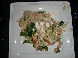 MIX TOGETHER OLIVE OIL, LEMON JUICE, GARLIC AND SALT AND PEPPER- THIS IS THE VINAIGRETTE. COOK ORZO AND DRAIN. ADD TOMATO, ARTICHOKES, AND SPINACH TO THE ORZO AND TOSS WITH DRESSING. ADD THE FETA LAST. I ALSO POURED SOME OF THE ARTICHOKE MARINATE OVER THE SALAD FOR EXTRA FLAVOR.
