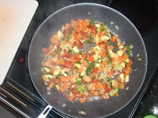 4)ADD THE TOMATOES, BASIL, THYME AND SEASON LIGHTLY WITH SALT AND PEPPER. COOK, STIRRING, FOR 1 MINUTE. REMOVE FROM HEAT AND LET COOL.