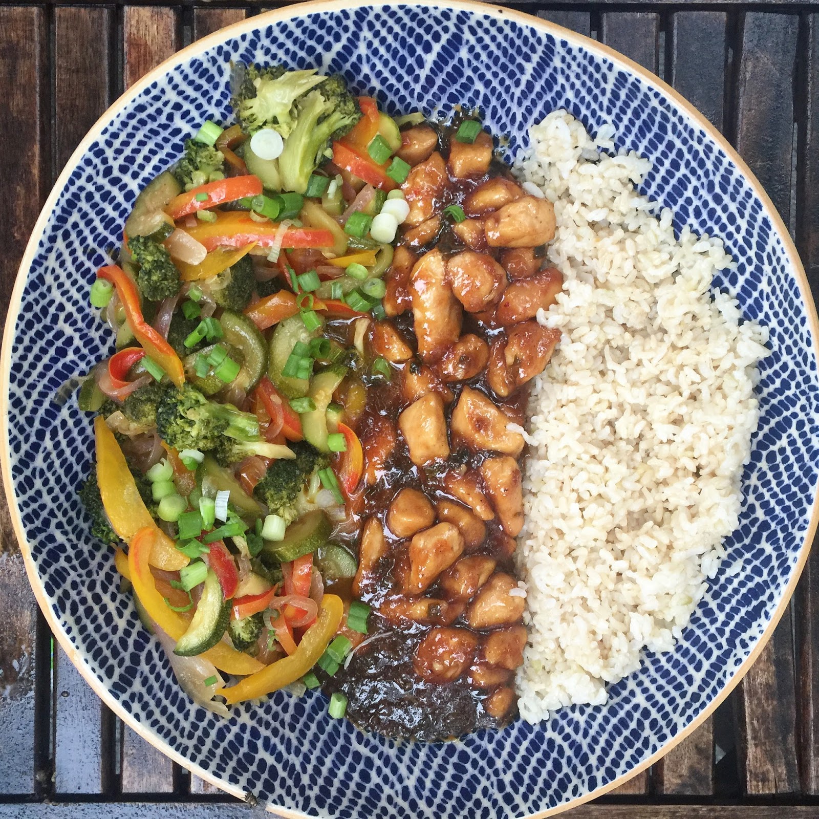 Whisk together all ingredients from the brown sugar through the corn starch. Then pour over veggies and let cook a few minutes. Remove from heat and sprinkle with green onions if desired and serve with rice and chicken.