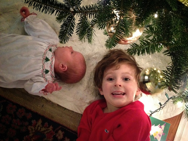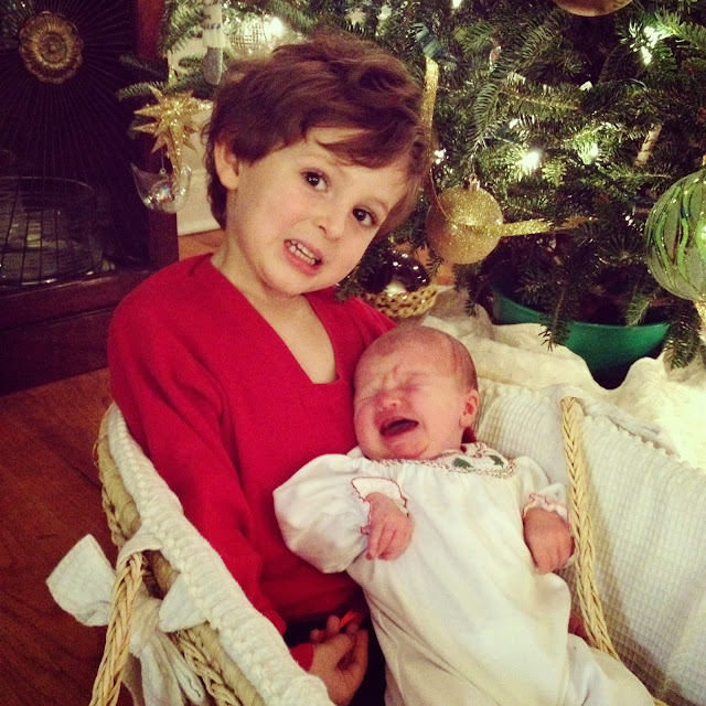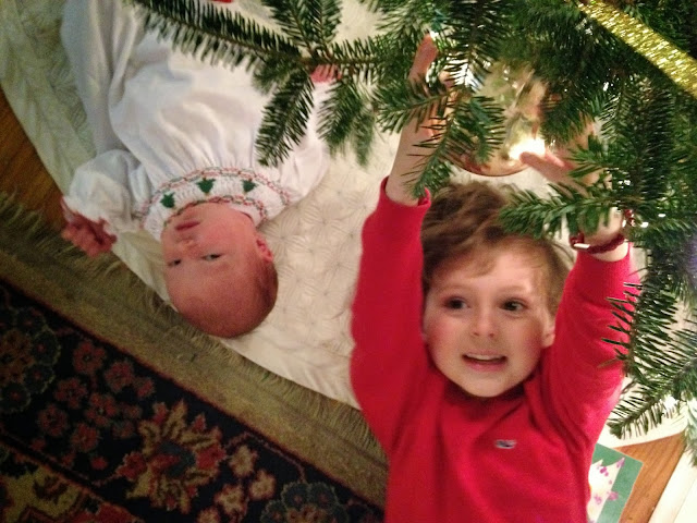 I wanted to wait til after Frances was born to try and get a picture with her and Sterling together. So after we put our tree up last weekend, I put them in some Christmas clothes and busted out my iphone to try and snap a few pictures. I had no idea how difficult it would be to get a good picture of the two of them. The outtakes however were hilarious.