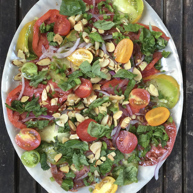 Drain the soaked onions and pat dry. Scatter half the almonds on a platter then top with tomatoes. Drizzle with the dressing and top with onion, jalapeno, mint, basil and remaining almonds.