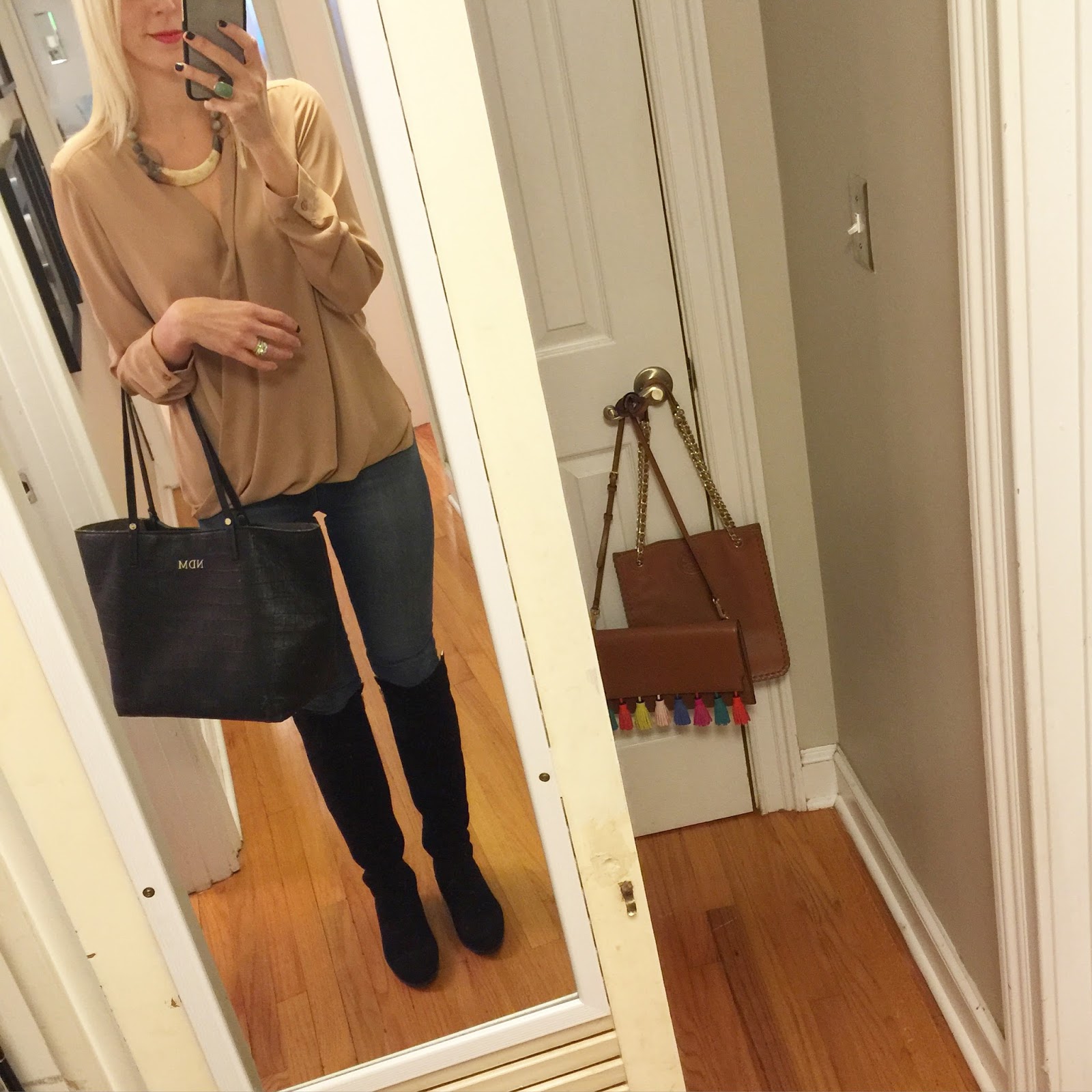 Blouse | T Marie Necklace | Jeans | Knee High Boots | Gigi Tote