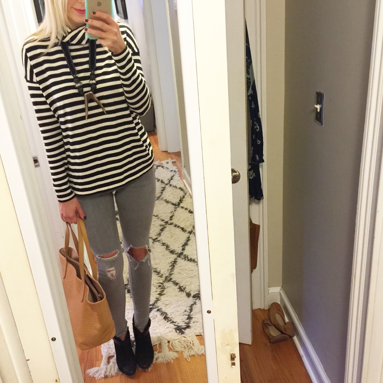 I LOVE the striped dress. Heels or booties would be perfect – you can add tights and a blazer too. Looks great!