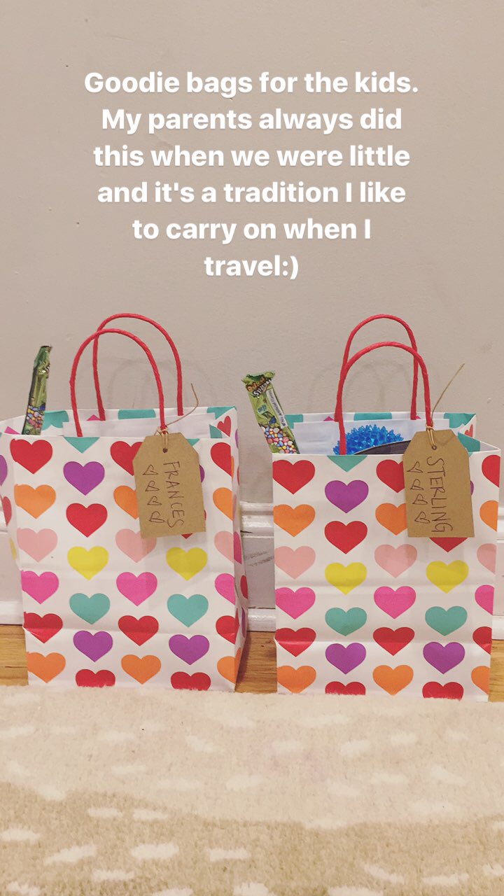 A few of you wanted to know about the goody bags I made Sterling and Frances before I left town. Whenever I leave town I try and do this as a treat for them (and to make me feel less guilty for leaving). I remember when my parents traveled they would leave us goodies and my dad would even leave us a note for each day they were gone. It suck with me and I like to do the same for the kids. I usually just go to the drugstore and get a few small things. I do small toy, a coloring or art book, a piece of their favorite candy, and sometimes a small stuffed animal.