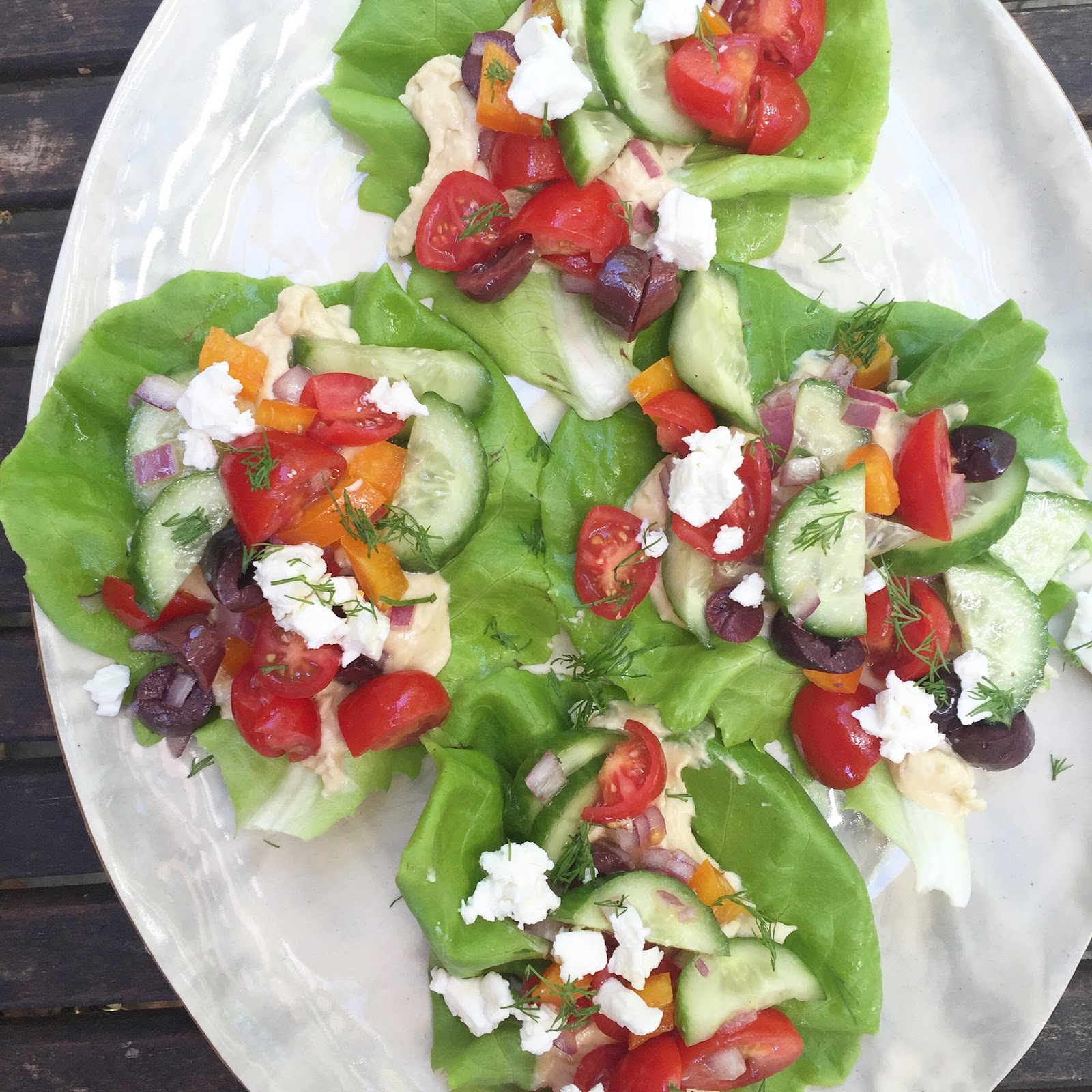 Take Bibb Lettuce and layer with Hummus. In a small combine diced cherry tomatoes, cucumber, red onion, orange bell pepper, and kalamata olives. Drizzle with olive oil, red wine vinegar and salt and pepper. Stir and then scoop on top of hummus and sprinkle with feta cheese.