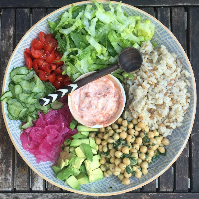 To assemble layer the brown rice/barley on the bottom. Top with chick peas, cherry tomatoes, pickled cucumbers, pickled red onion, shredded lettuce, avocado and Greek yogurt sauce.