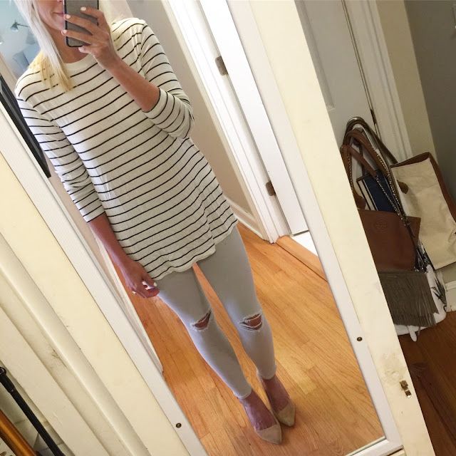 I wanted to share this stripe and peplum tee I found at Loft this week. I am sucker for stripes and I loved the fit. It is made of a thicker tee shirt material and under $40. I bought a small. I might could have worn an XS but they did not have one in the store and I figured it would shrink some as I washed it.