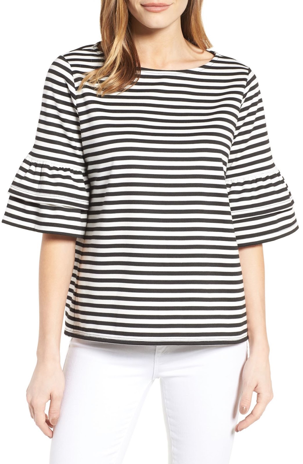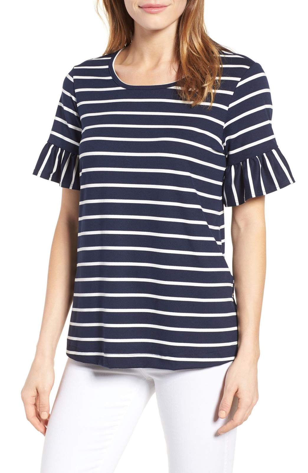 I love the nautical look of this one paired with white jeans. It comes in several other colors too.
