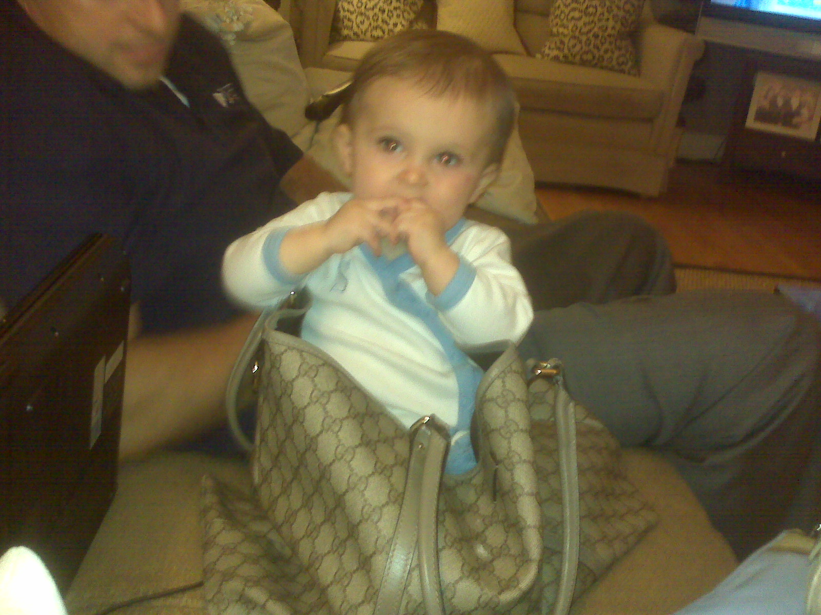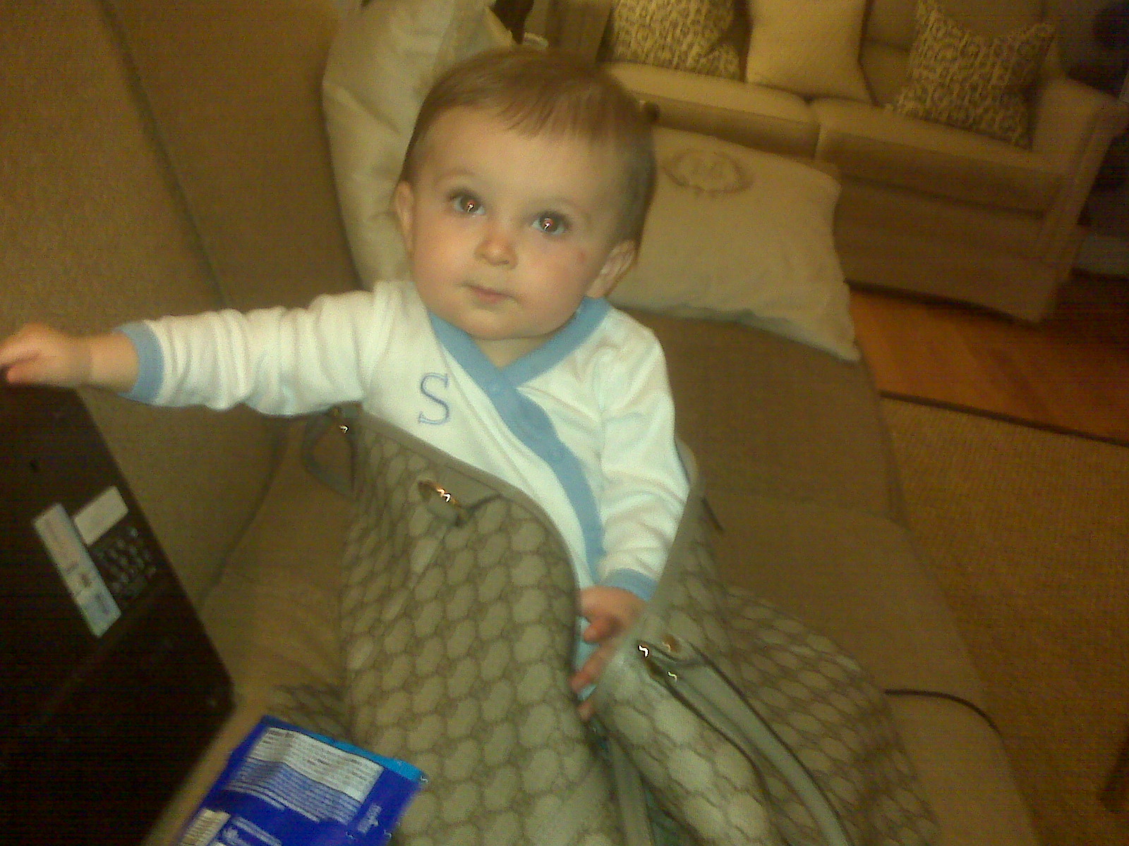 To fit my sweet baby in of course! Matt put Sterling in my Gucci Purse/Diaper Bag this weekend and I could not stop laughing. Sterling actually liked being inside my purse. He sat in there for awhile and enjoyed his crackers. And no, I don’t treat him like a dog and carry him around in my purse but these pics were too cute not to post. I knew I had a big purse for something other than diapers, formula, and baby toys:) Anything that will keep my baby occupied for a few minutes makes Momma very happy. For once Matt said my purse was money well spent!
