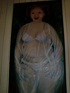 Now for the strange artwork. We looked above our table and noticed this weird child with an adults body wrapped in plastic.